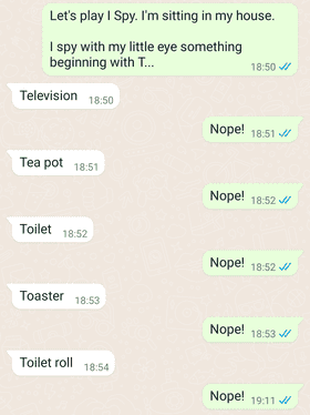 این بازی هم یکی بازی کلاسیک است، بازیای که نسلها مورد علاقه خانوادهها بوده است. این بازی تقریبا مانند بازی 20 سوال است. به حریف خود بگویید در چه مکانی هستید، به اطراف خود نگاه کنید تا زمانی که چشم شما به چیزی خاص توجه کند. سپس حریف شما باید حدس بزند که چه چیزی را جاسوسی کردهاید.