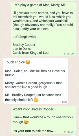 در این بازی یکی از شما به دیگری پیام میدهد که چه میشد اگر؟ و سپس یک سناریو را مطرح میکند و میپرسد که در آن موقعیت چه کاری انجام میدهند. در اینجا هیچ پاسخ صحیح یا نادرستی وجود ندارد. دیدن پاسخهای داده شده نه تنها سرگرمکننده است، بلکه میتواند بینشی از دیدگاه دوست یا اعضای خانواده خود در زندگی به شما بدهد.