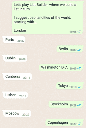 بازی List Builder یک بازی رقابتی است که در آن هر بازیکن به نوبت چیزی متعلق به یک سبک خاص را نامگذاری میکند. این لیست میتواند شامل پایتختها، بازیگران مجموعهای از فیلمها یا هر چیز دیگری باشد که ذهن شما میتواند تصور کند. برنده آخرین فردی است که با موفقیت یک مورد را به لیست اضافه میکند.