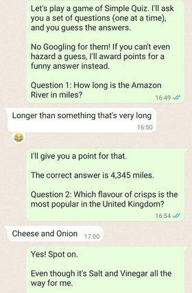 در قالب یک بازی پیامکی که میتوانید در یک برنامه چت بازی کنید، Simple Quiz از یکی از شما میخواهد یک سؤال اطلاعات عمومی از دیگری بپرسید. سپس طرف مقابل باید سعی کند پاسخ صحیح را بدهد، یا اگر نمیداند، خندهدارترین جواب قابل تصور را بدهد.