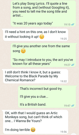بازی Song Lyrics به این صورت است که یک نفر از طریق متن یا در یک رشته پیام، خطوطی را از یک آهنگ به دیگری نقل قول کند. سپس شخص دیگر باید آهنگ مربوطه را حدس بزند. این بازی برای شما و کسی که ارتباط نزدیکی با هم دارید یا با او سلیقه موسیقی مشابهی دارید، بسیار مناسب است.