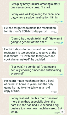 حتی کسانی که عادت به خلق دنیاها، شخصیتها و طرحهای داستانی ندارند، میتوانند از این بازی ساده و در عین حال مؤثر لذت ببرند. با Story Builder، یکی از شما داستان را با ارسال یک جمله آغازین به شخص دیگر شروع میکند. سپس شخص دیگر جمله دوم داستان را به شخص اول پیام میدهد. به آرامی، شما دو نفر در طول چندین متن یا یک رشته پیام، یک داستان میسازید.