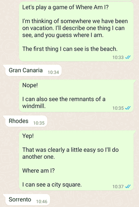 با این بازی، هر بازیکن به نوبه خود یکی از ویژگیهای محیط اطراف خود را توصیف میکند، در حالی که دیگری سعی میکند حدس بزند که کجا هستند. شما میتوانید با تغییر سطح جزئیاتی که به حریف خود میدهید، این بازی را به آسانی یا سختی که دوست دارید انجام دهید.