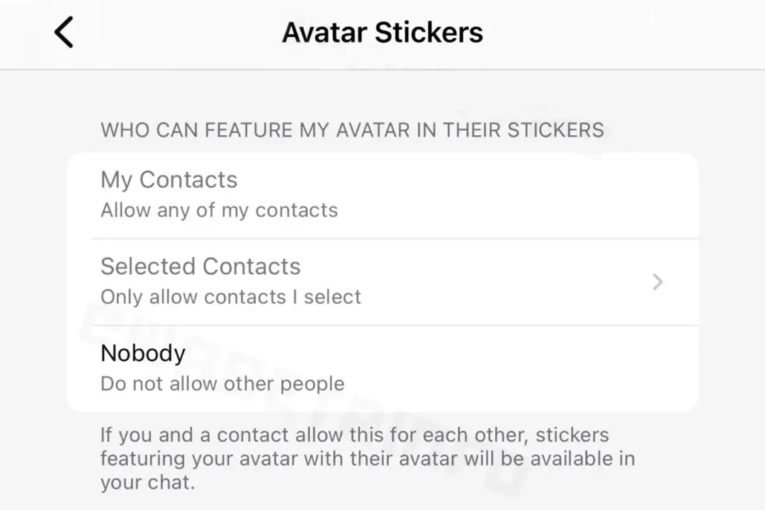 واتساپ در بخش ارسال استیکر با تصاویر کاربران نیز تغییراتی ایجاد کرده است. به لطف این تغییرات، هر کاربر میتواند تنظیمات حریم خصوصی برای ایجاد استیکر از آواتار خود را اختصاصی کند و این قابلیت را به یکی از سه گزینهی مخاطبان منتخب، مخاطبان من یا هیچکس محدود کند.