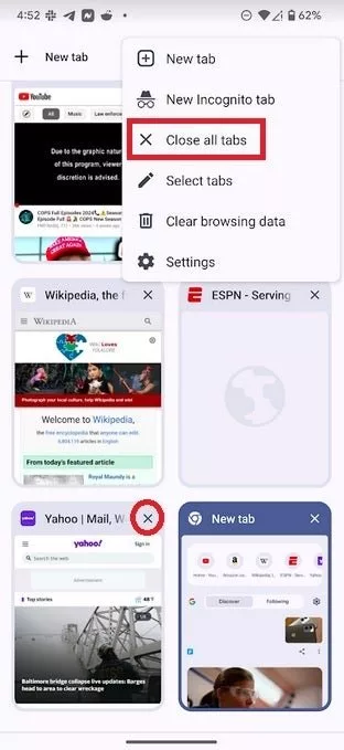کاربران می‌توانند با لمس علامت ضربدر موجود در سمت راست بالای هر برگه، آن را حذف کنند. اما بسته به تعداد برگه‌هایی که باز کرده‌اید، انجام این کار می‌تواند زمان‌بر باشد. درعوض، می‌توان روی منوی سه نقطه در سمت راست بالای صفحه ضربه بزنید و روی Close all Tabs ضربه بزنید. ابزار “Tab Declutter” تمامی این کارها را به‌صورت خودکار انجام می‌دهد.