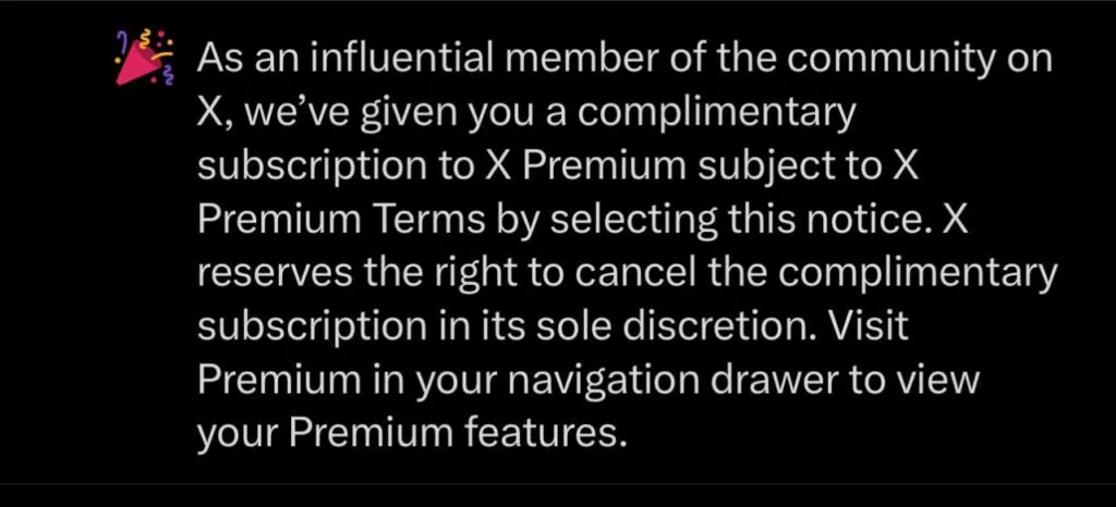 طبق اسکرینشات بهاشتراکگذاشته توسط نویسنده Business Insider، کاربران ایکس که از این طریق تیک آبی دریافت کردهاند، پیغام زیر را دریافت میکنند.