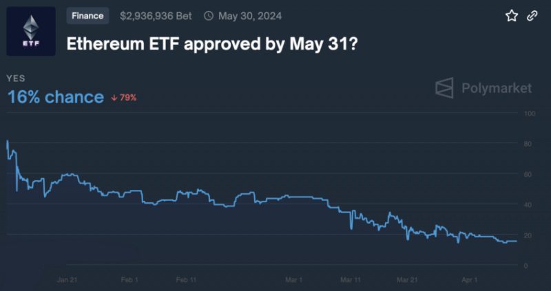 با وجود این، «اریک بالچوناس»، تحلیل‌گر صندوق‌های قابل معامله در بورس، با اشاره به امتناع کمیسیون بورس و اوراق بهادار ایالات متحده از ارائه بازخورد و پاسخ درمورد درخواست‌های ETF، ابراز تردید کرد. این احتیاط، نشان‌دهنده احساس کلی بازار است، به‌گونه‌ای‌که طبق تخمین‌های پُلی‌مارکت (Polymarket)، تنها 16 درصد احتمال برای تأیید صندوق‌های قابل معامله در بورس مبتنی بر اتریوم تا مهلت ماه (مِی) وجود دارد.
