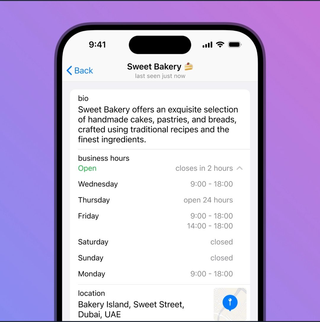 به گزارش رسانه مدیاتی، از امروز، هر کسی میتواند حساب تلگرام خود را به یک حساب تجاری تبدیل کند و به ویژگیهای مخصوص مانند ساعات کاری، مکان، پاسخهای سریع، پیامهای خودکار، صفحه شروع سفارشی، پشتیبانی از ربات چت و موارد دیگر دسترسی داشته باشد.