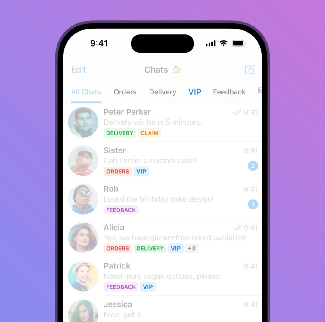 این کار به شما کمک میکند تا به سرعت بین مشتریان در لیست چت خود بر اساس وضعیت، نیازها یا سطح اولویت آنها تفاوت قائل شوید. همه کاربران تلگرام میتوانند با افزودن برگههای جداگانه به لیست چت برای محل کار، مدرسه، اخبار و موارد دیگر، پوشههای چت سفارشی ایجاد کنند تا چتهای خود را سازماندهی کنند.