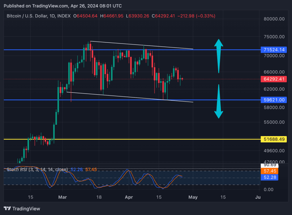به گزارش کریپتودیلی (Crypto Daily) محدوده قیمتی بین 60,000 تا 70,000 دلار از اواسط مارس قیمت بیت کوین را محدود کرده است. به‌نظر می‌رسد بیت کوین بدون توجه به رویدادهای ژئوپلیتیکی جهانی، وخامت اوضاع اقتصادی و موارد مشابه، در یک روند خنثی معامله می‌شود و سرمایه‌گذاران و معامله‌گران از جهت‌گیری نهایی آن مطمئن نیستند.