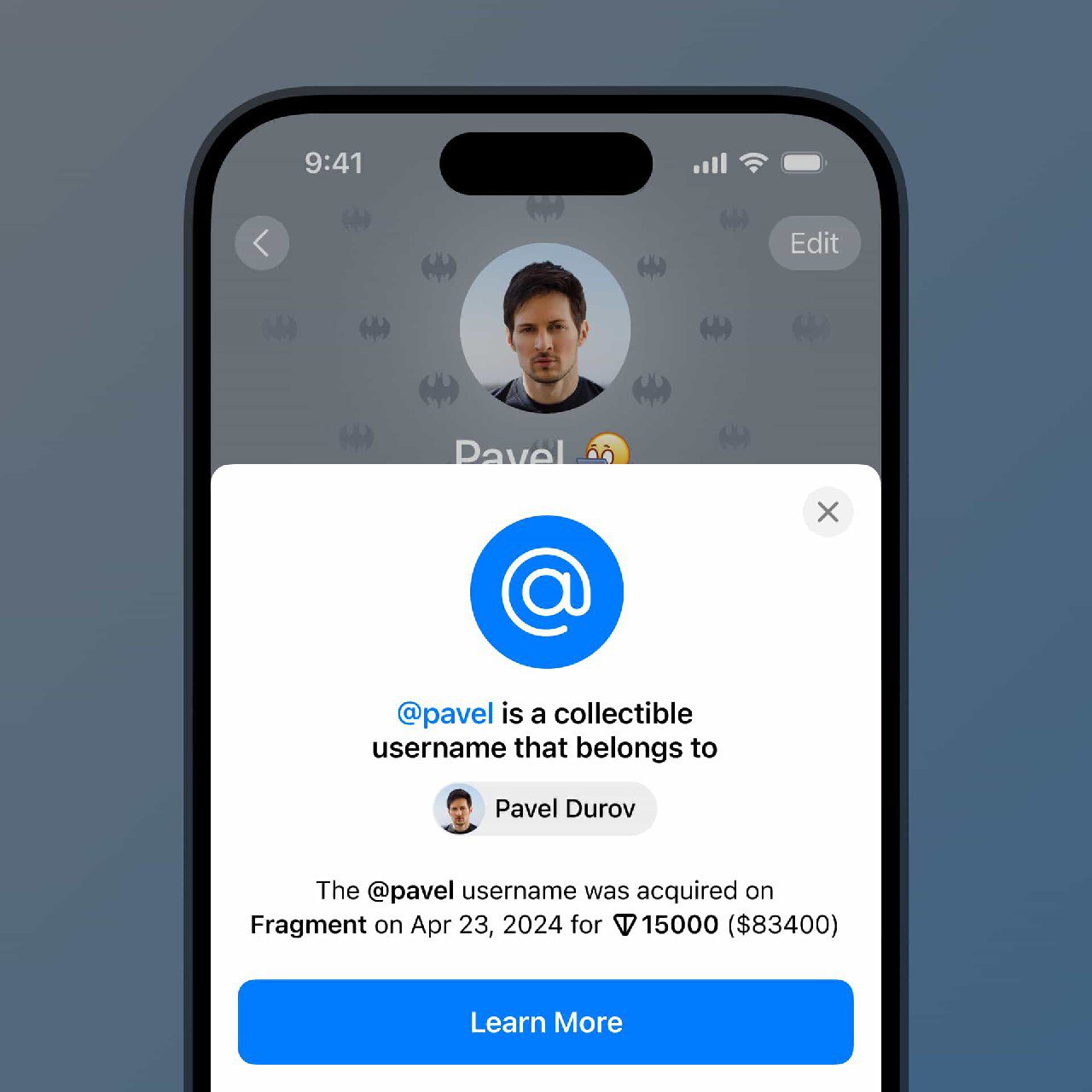 صاحبان نامهای کاربری کالکتیبل میتوانند آنها را به حساب یا کانال تلگرام خود پیوند دهند. اکنون با ضربه زدن روی یک نام کاربری یا شماره ناشناس در نمایه یک فرد، اطلاعات اضافی درباره حساب کالکتیبل به دست میآید. این حسابها را میتوان در پلتفرم Fragment که از بلاک چین TON استفاده میکند، خرید و فروخت.