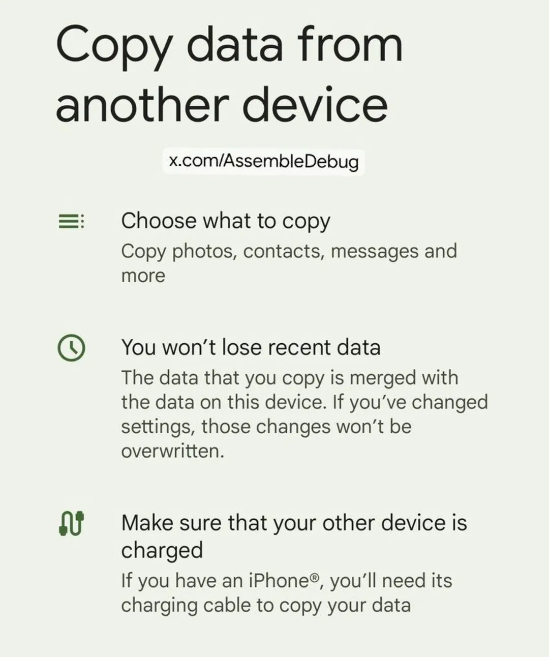 کاربران قبلاً فقط زمانی میتوانستند این کار را انجام دهند که یکی از دستگاهها را ریست فکتوری کرده باشند. قابلیت جدید اندروید محدودیتهایی دارد؛ مثلاً فقط میتوانید دادهها را از دستگاهی کپی کنید که قبلاً برای کپی دادهها از آن استفاده کرده باشید.
