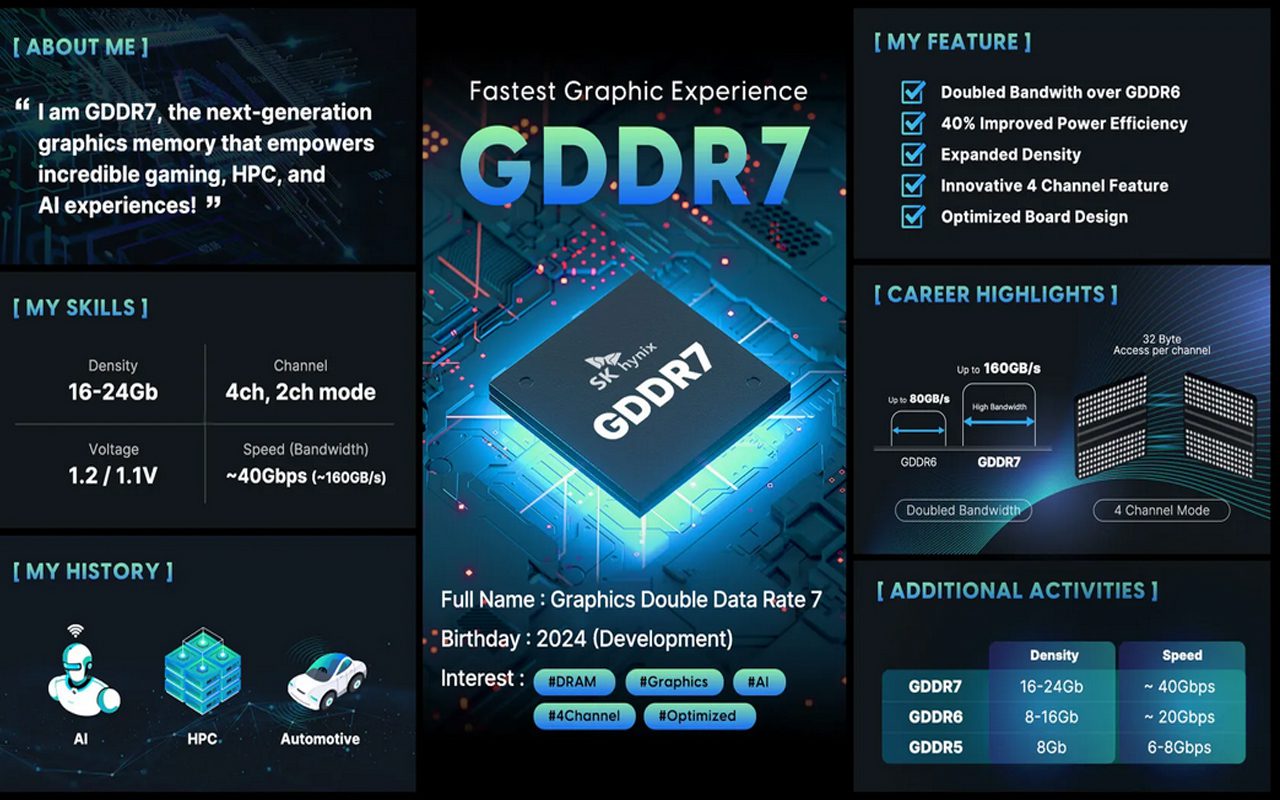 در نمایشگاه Computex، SK Hynixنمونههای مهندسی چیپهای GDDR7 خود را به نمایش گذاشت که با تراکم 16 گیگابیت و 24 گیگابیت در دسترس خواهند بود. SK Hynix برای محصولات GDDR7 خود سرعت انتقال داده 40 گیگابیت بر ثانیه را هدف قرار داده است که از سرعت 32 گیگابیت بر ثانیه رقبایی که قطعات 16 گیگابایتی خود را معرفی میکنند، فراتر میرود.