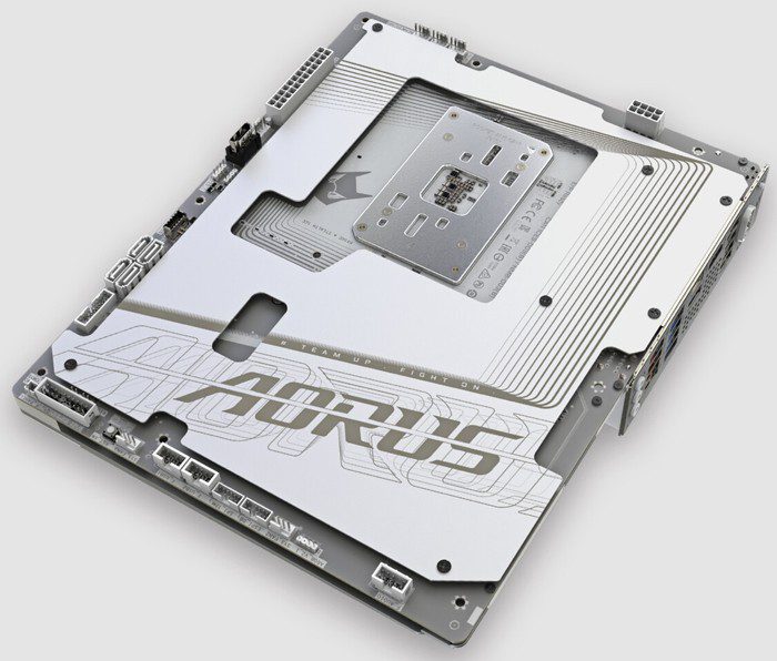 نهتنها مادربرد B650E Aorus Stealth Ice به PCB سفید و مشکی رنگ مجهز شده تا از نظر ظاهری به طور یکپارچه با بدنه کیس به نظر برسد، بلکه گیگابایت تمامی درگاههای این مادربرد را به پشت آن منتقل کرده است تا امکان پنهان کردن کابلها به راحتی فراهم شود.