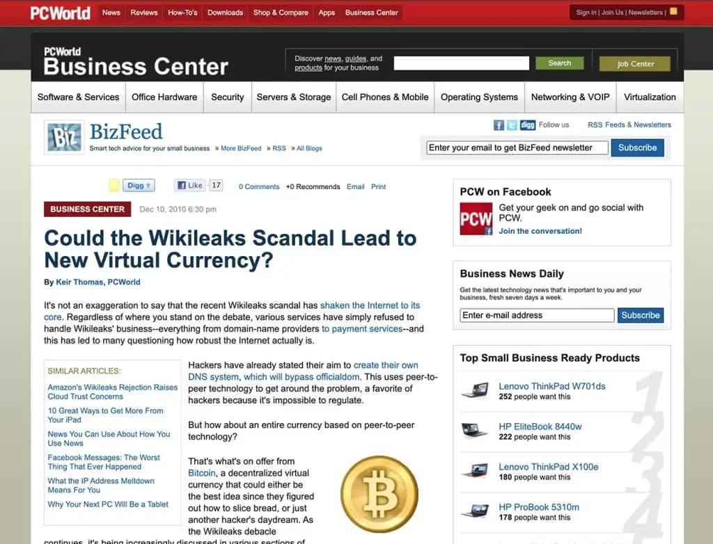 کایر توماس نویسنده PCWorld، این مفهوم را در دسامبر 2010 در مقالهای با عنوان «آیا رسوایی ویکی لیکس میتواند به ایجاد ارز مجازی جدید منجر شود؟» معرفی کرد. این مقاله کاملاً بر اساس اطلاعات واقعی بود و هیچگاه به معنای سیاسی از ویکی لیکس حمایت نکرد. با این حال، این داستان همچنان توجه ساتوشی ناکاموتو را به خود جلب میکرد که یک روز پس از انتشار آن به صورت زنده با ارسال آخرین نظر عمومی خود در یک فروم آنلاین واکنش نشان داد: