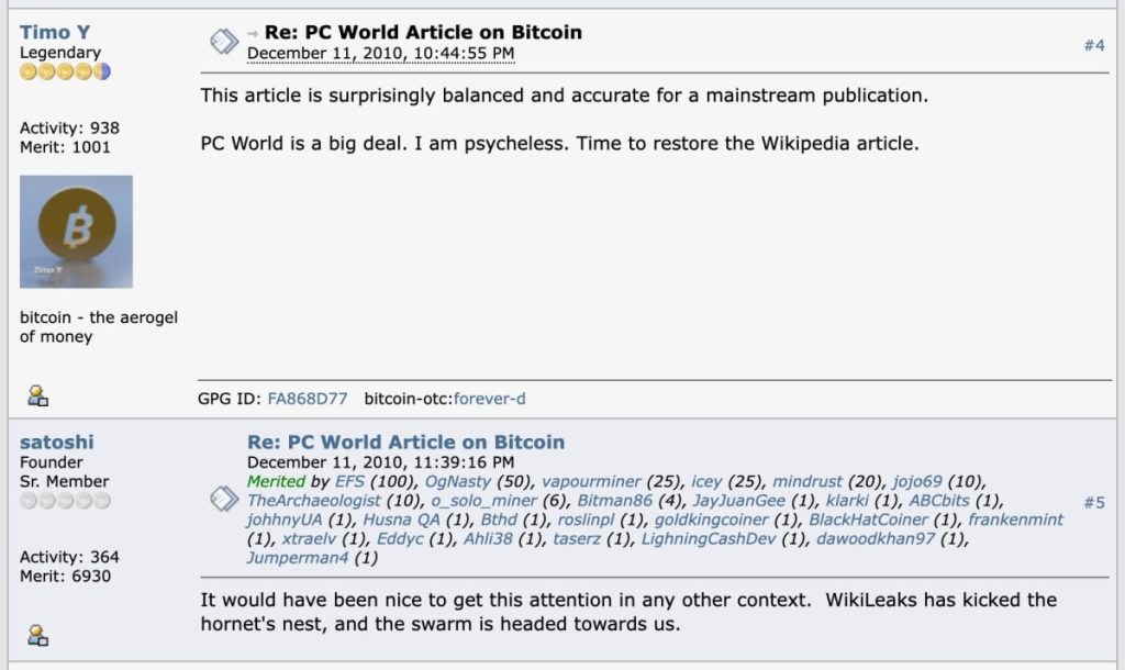 در آن زمان هنوز مناقشات بیت کوین بر سر تأثیرات زیست محیطی و افزایش شدید قیمت GPU وجود نداشت. در عوض، همهمۀ اصلی در مورد مخترع مرموز و آرمان گرای بیت کوین (یا هویتی) به نام ساتوشی ناکاموتو بود که مفهوم یک ارز دیجیتال کاملاً دموکراتیک را ایجاد کرد که هیچکس نمیتوانست کنترلش کند. این ماهیت غیرمتمرکز و منحصر به فرد بیت کوین الهام بخش یک نویسندۀ مستقل در PCWorld بود تا گزارش دهد که شاید ویکی لیکس و بیت کوین بتوانند همکاری کنند.