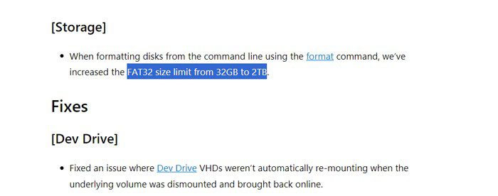 بروزررسانی اخیر سیستمعامل ویندوز برای افرادی در کانال Canary منتشر شده که در طرح Windows Insider مشارکت دارند. این نسخه از ویندوز میتواند درایوهای FAT32 با حداکثر ظرفیت 2 ترابایت را ایجاد کند. هماکنون، دسترسی به این ویژگی تنها از طریق خط فرمان ویندوز امکانپذیر است و در صورتی که از کادر محاورهای ویندوز برای فرمت کردن درایوها استفاده میکنید، به این قابلیت دسترسی نخواهید داشت.