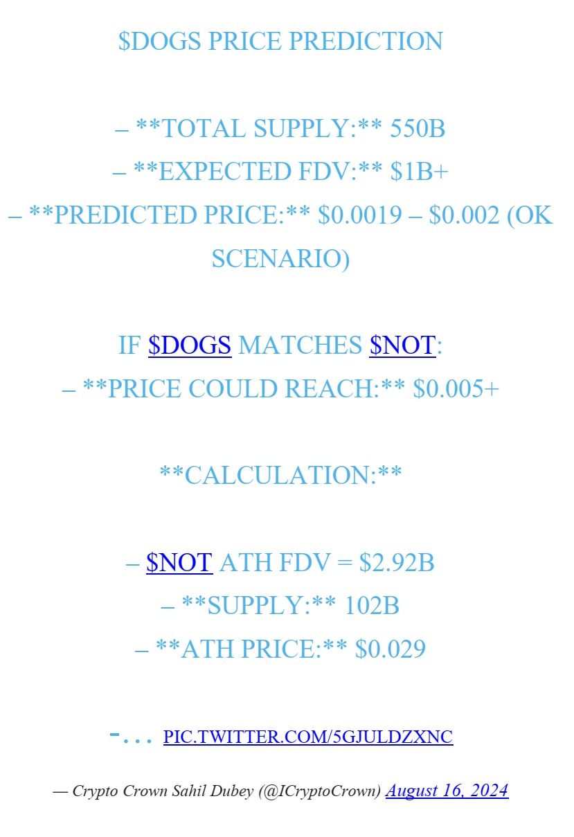 اگر قرار بود DOGS در یک FDV اولیه 1 میلیارد لیست شود، قیمتش در حدود 0.0018 دلار خواهد بود، با این فرض که عرضۀ کل آن 550B در نظر گرفته شده باشد.